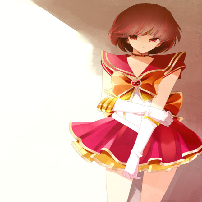 This is an image of Astarte, a fictional character, the physical incarnation of the goddess Astarte in Sailor Moon. Sailor Astarte wears a brown and yellow sailor uniform. Her hair is dark brown and kept short. Collar, boots, bow top, sleeves, necklace, back bow and brown gem crown.